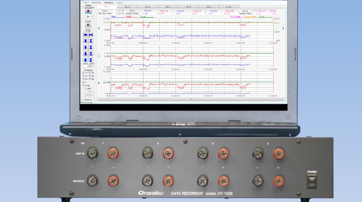 負荷試験時にスピーカなどに入力された音声信号の電圧,電流,電力,音圧変化と音声信号を最大100時間記録します
